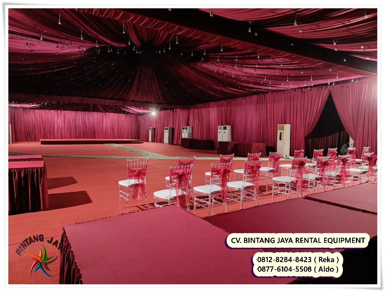 Kami siap melayani anda yang berada di daerah Jakarta, Bekasi, Bandung, Bogor, Serang, Tangerang, Purwakarta, Banten, Karawang, Cikarang, Cikampek, dan sekitarnya. Bagi anda yang sedang merencanakan acara outdoor dengan tenda yang luas dan megah, sewa saja tenda roder pada kami CV. Bintang Jaya Event.