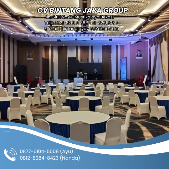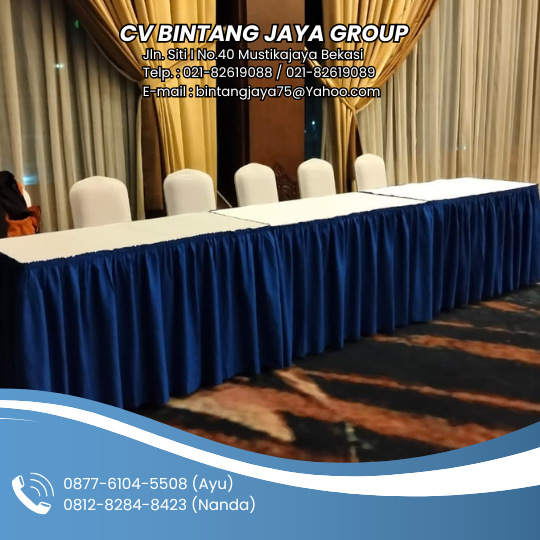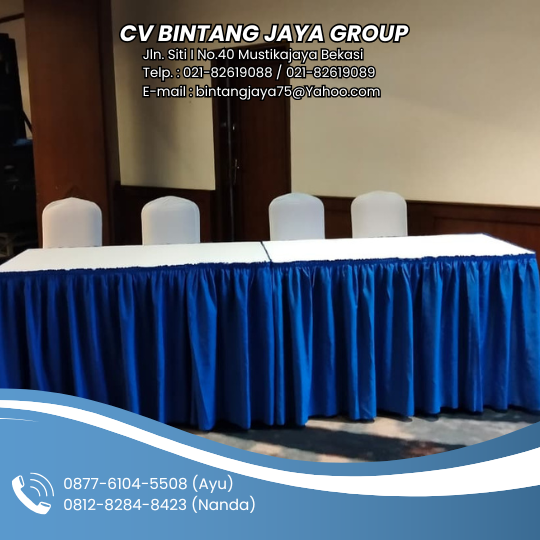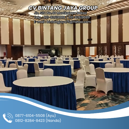 Pusat rental round table dan meja kotak taplak putih biru jakarta dengan kualitas yang terjamin bermutu, harga sewa yang terjangkau murah dan siap kirim keberbagai tempat dan lokasi se jabodetabek dan sekitarnya. Anda sedang membutuhkan meja bundar dan meja kotak? Pilihan tepat dan cepat ada di sini CV BINTANG JAYA GROUP terlengkap, termurah dan amanah. Menerima segala macam sewa alat alat properti dengan harga yang relatief terjangkau murah.