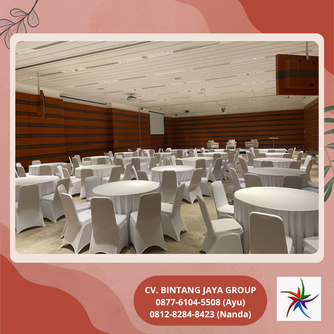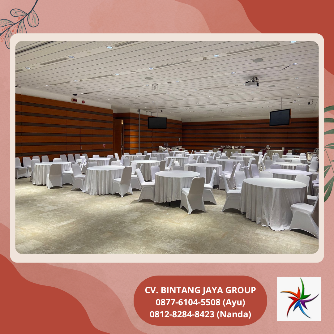 Dengan begitu, meja bundar dengan cover jatuh rapi dan kursi ergonomis melengkapi set up ini agar tampilan venue terlihat seragam dan profesional. Tak ketinggalan, tim kami bakal bantu atur layout semua item ini biar alur tamu lancar dan foto dokumentasi jadi lebih estetik dari segala angle. Oleh karena itu, kamu bisa fokus ke konten acara, urusan furnitur biar kami yang handle sampai beres.